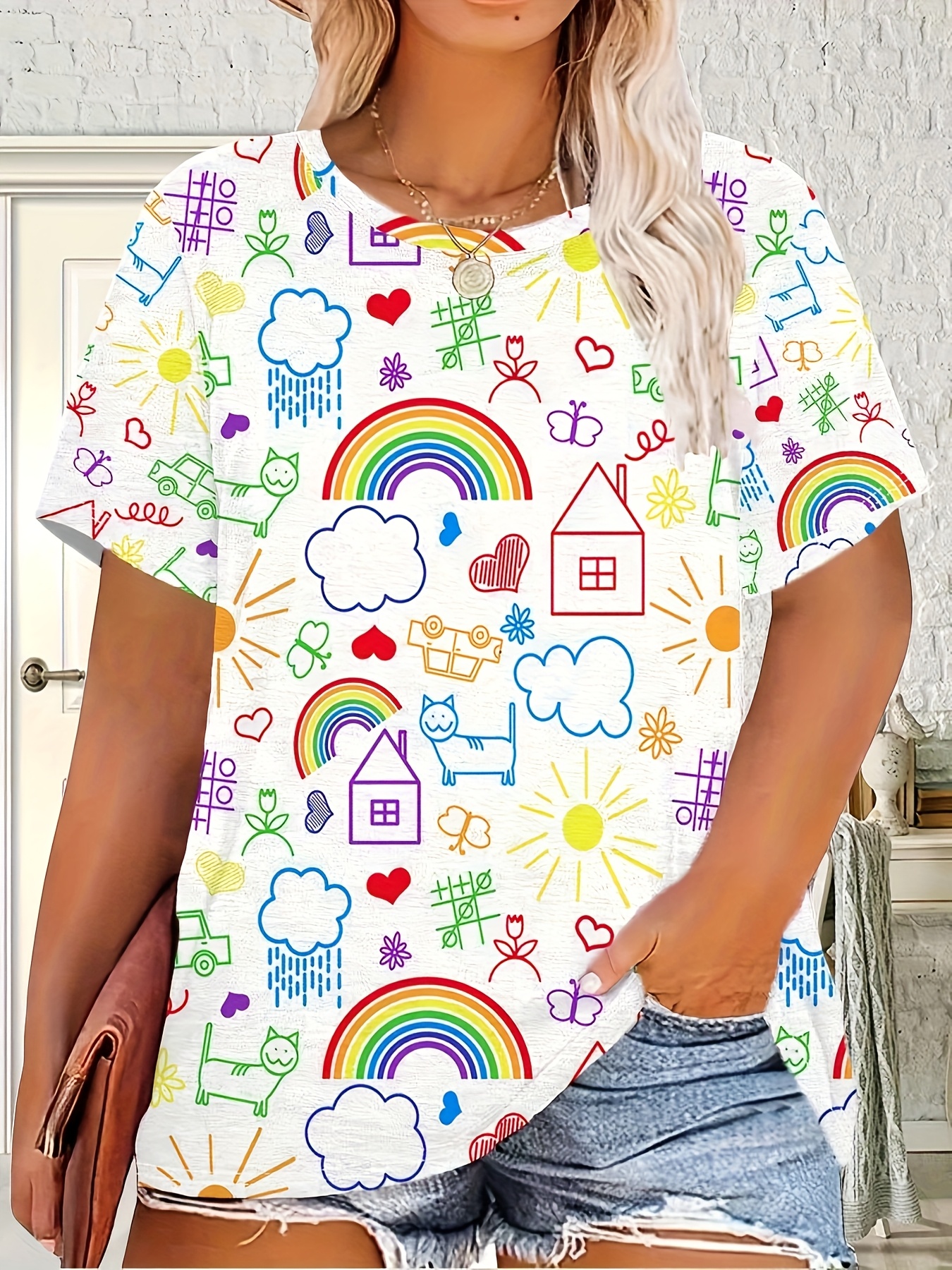 Plus Size - Fun Graffiti 3D Print, Comfortable And Breathable Elastic Fabric, Casual Loose Fit, Machine Washable Round Neck Short Sleeve T-Shirt, Suitable for Spring, Summer, And Autumn Outdoor And Weekend Gatherings.