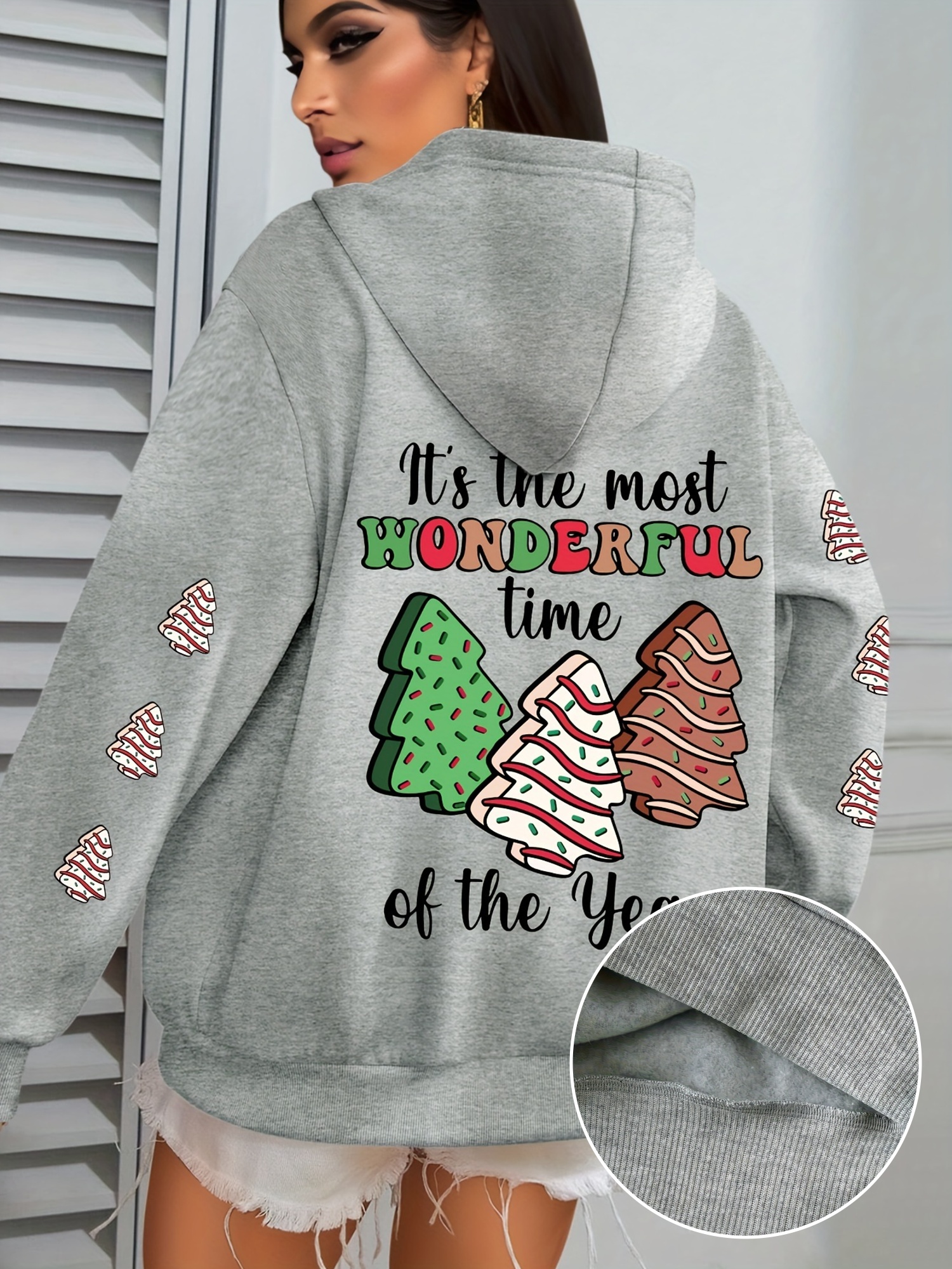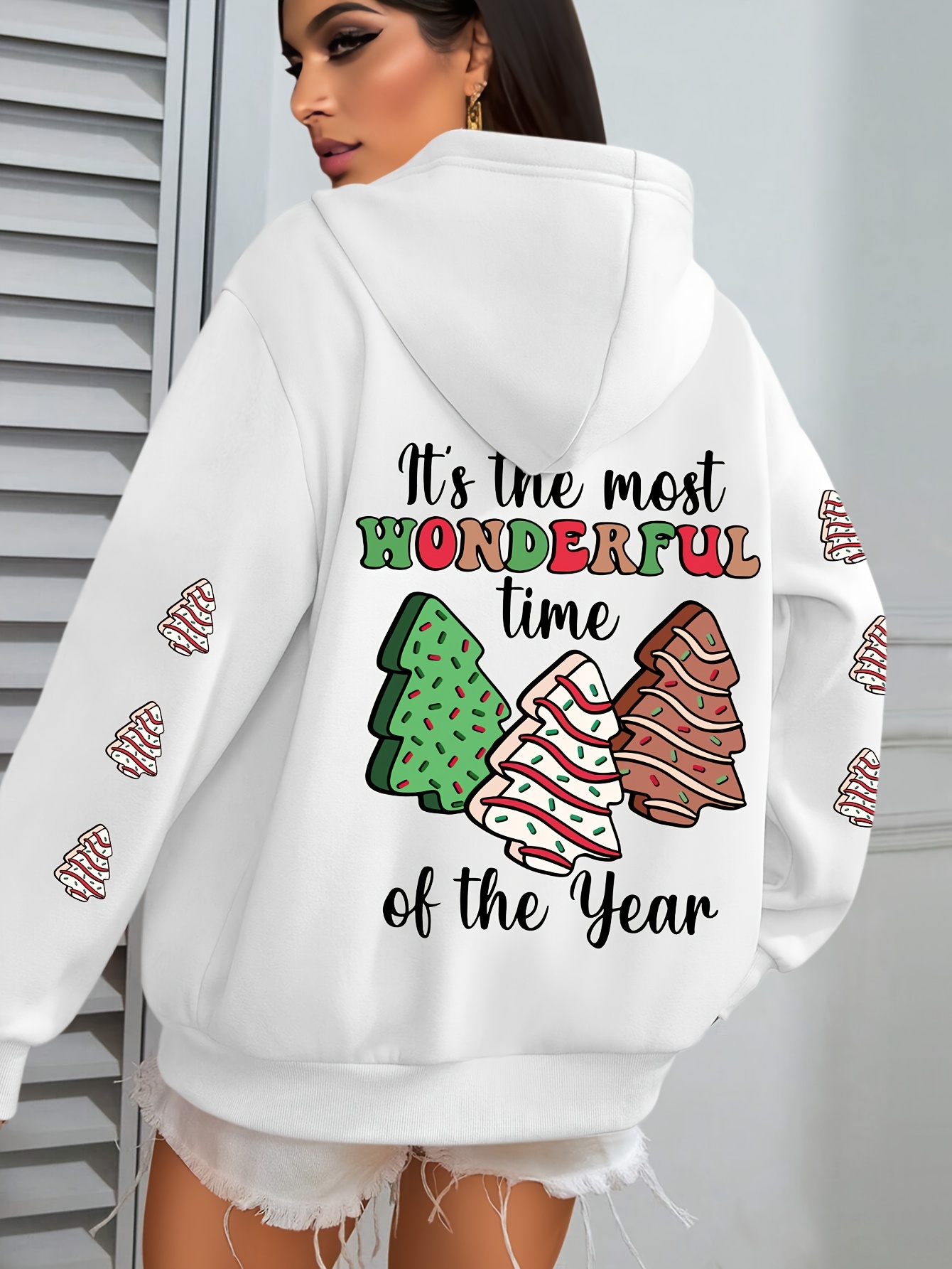 Winter Warmth | Women's Plus Size Christmas Tree Print Hoodie - Cozy Long Sleeve Pullover with Pockets, Festive "It's the Most Wonderful Time of the Year" Design, Perfect for Fall & Winter Casual Wear
