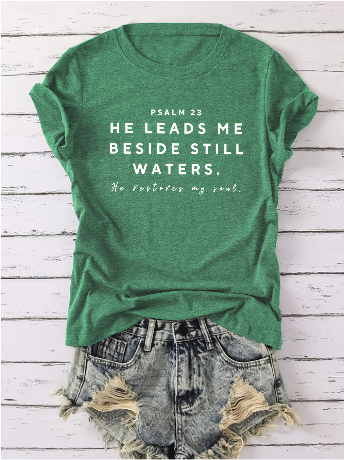 Women's Turquoise Christian Faith T-Shirt with Psalm 23 "He Leads Me Beside Still Waters" Bible Verse - Soft Round Neck Casual Tee, Comfortable Casual Attire, Sizes S-XXL, Machine Washable Inspirational Apparel