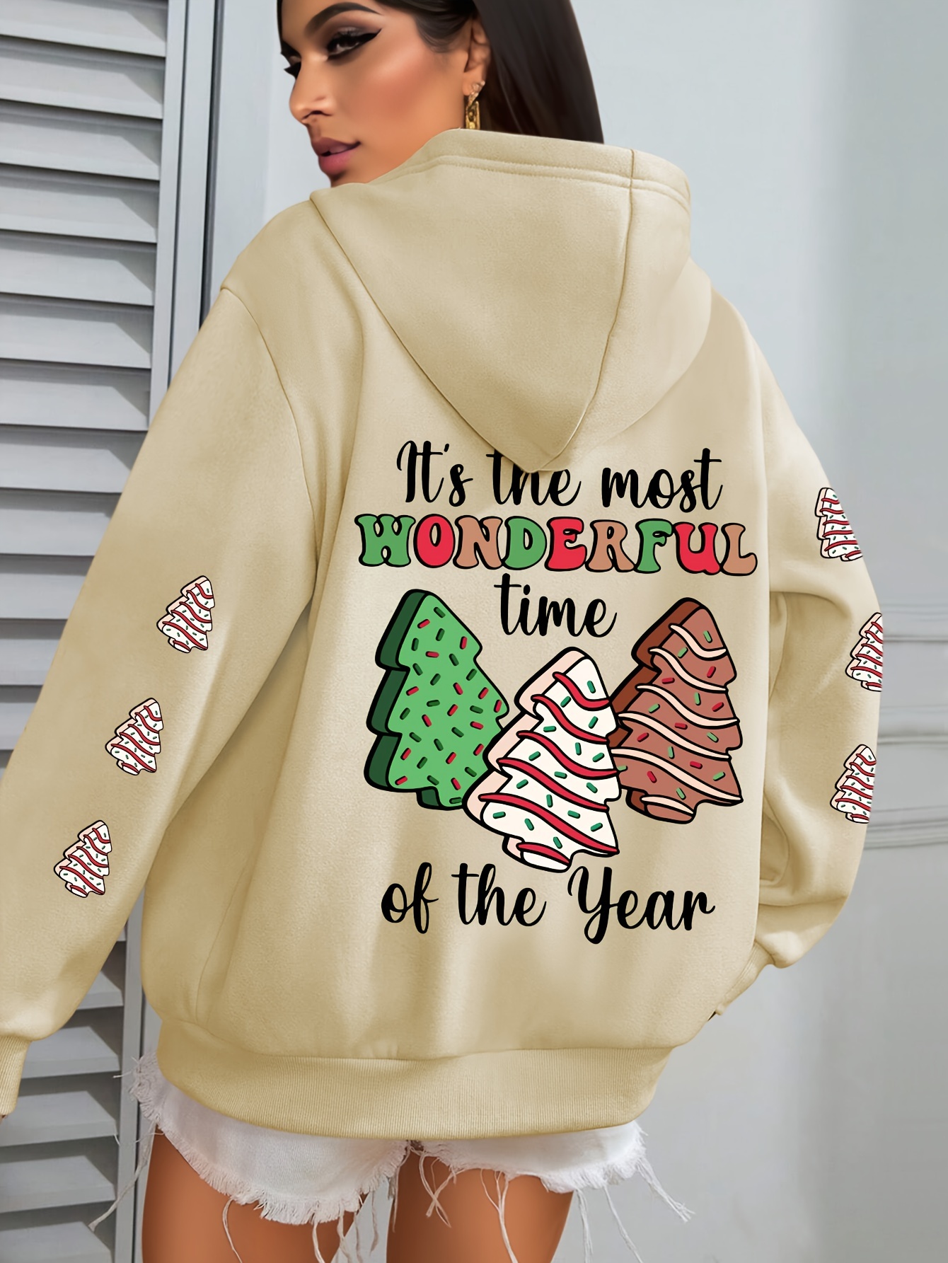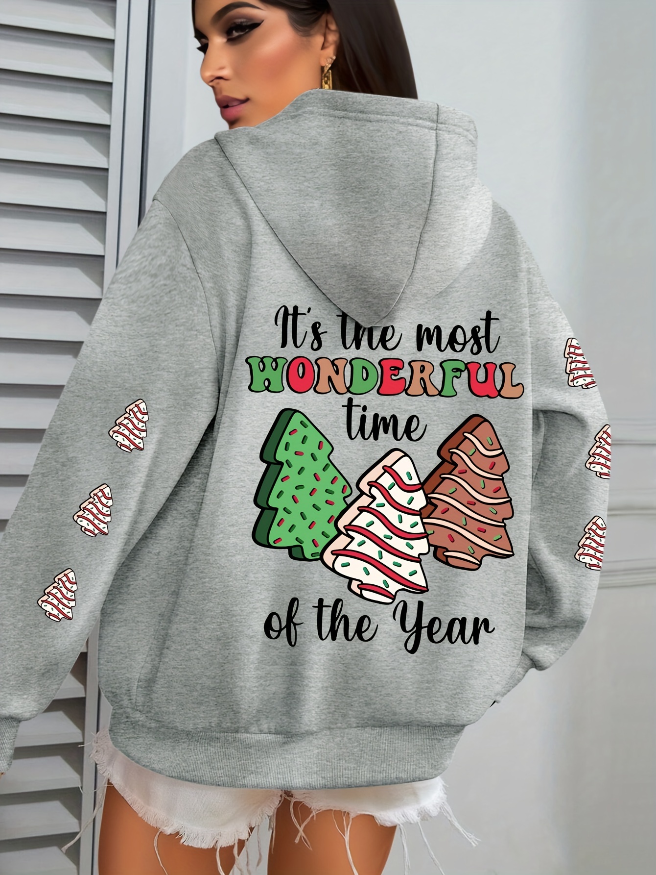Winter Warmth | Women's Plus Size Christmas Tree Print Hoodie - Cozy Long Sleeve Pullover with Pockets, Festive "It's the Most Wonderful Time of the Year" Design, Perfect for Fall & Winter Casual Wear