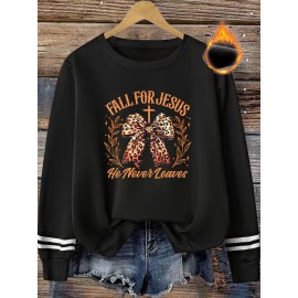 Plus Size, Women's Plus Size Long Sleeve Sweatshirt - Religious Christmas Graphic "Fall for Jesus He Never Leaves" - Black with Orange Lettering - Casual Pullover Top for Church, Everyday Winter Wear - Machine Washable
