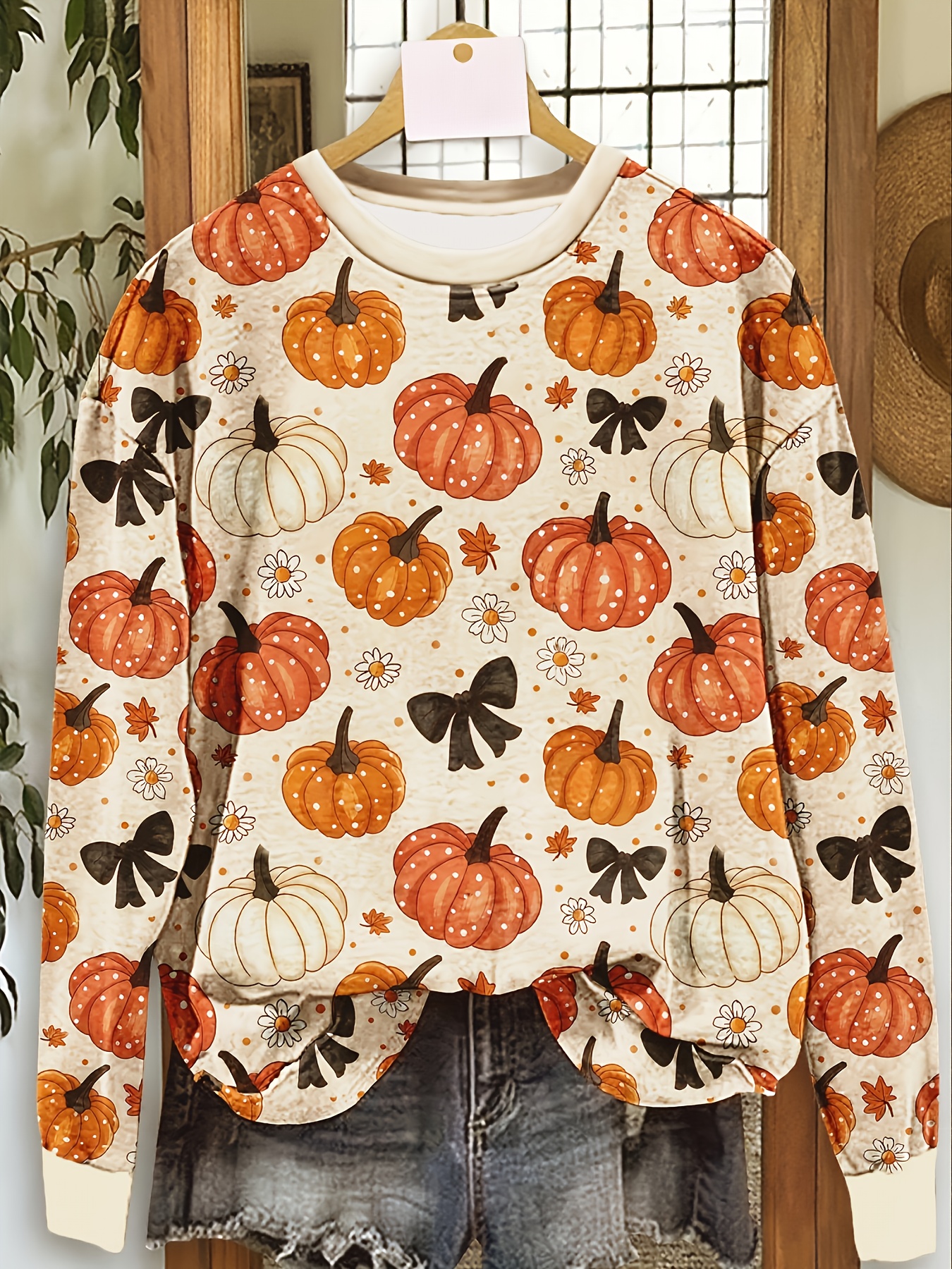 Plus Size, Plus Size Women's Halloween Pullover Sweatshirt - Oversized Casual Round Neck Long Sleeve with Pumpkin Floral Butterfly Print, Machine Washable Fall Autumn Holiday Party Top