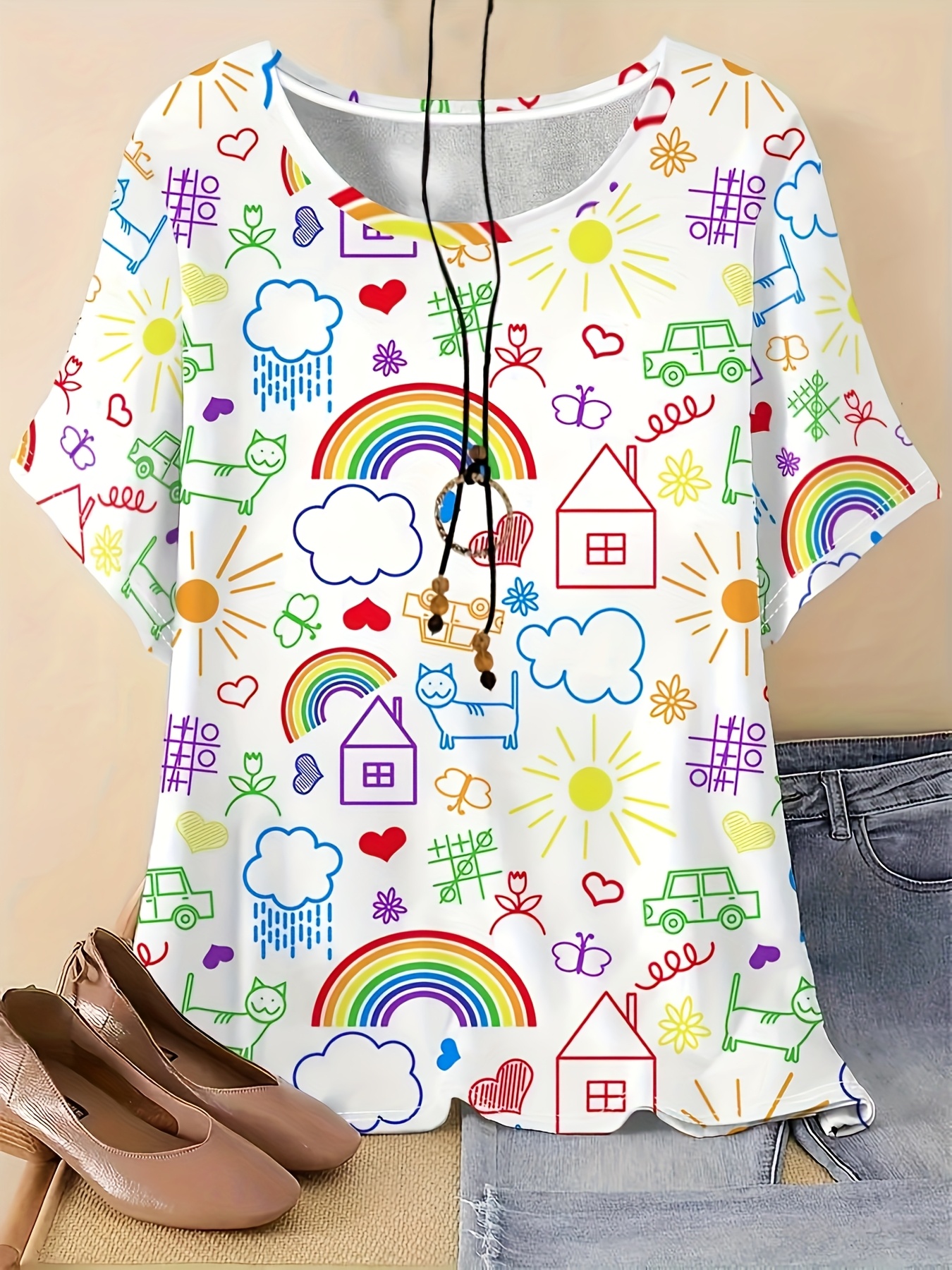 Plus Size - Fun Graffiti 3D Print, Comfortable And Breathable Elastic Fabric, Casual Loose Fit, Machine Washable Round Neck Short Sleeve T-Shirt, Suitable for Spring, Summer, And Autumn Outdoor And Weekend Gatherings.